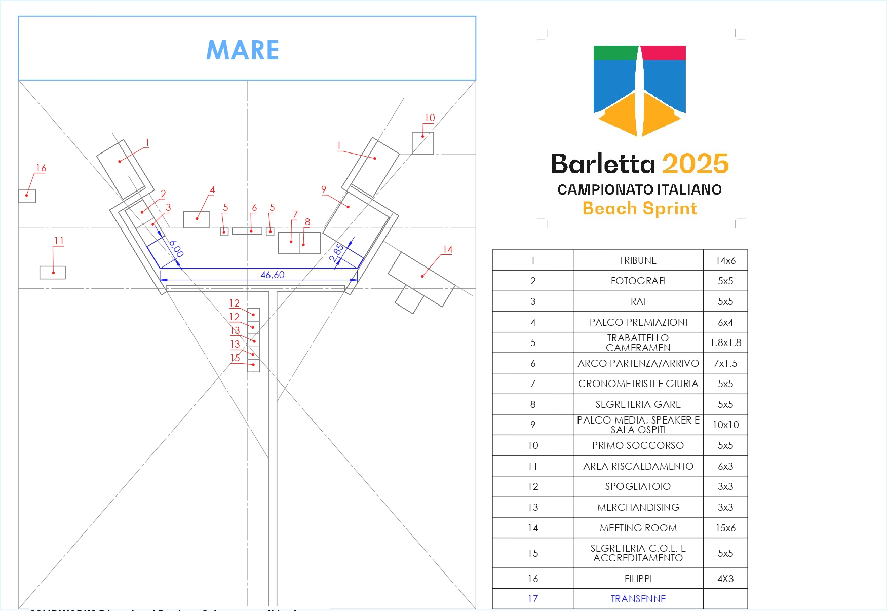 Segnaliamo la planimetria del campo gara dei Campionati Italiani di beach sprint in programma a Barletta da venerdì 12 a domenica 14 settembre. Un campo di regata, quello sul lungomare intitolato alla leggenda dell’atletica Pietro Mennea, che mantiene anche ai Tricolori quel respiro internazionale, negli spazi riservati ad ogni componente del lungo weekend di gare, guadagnato dopo l’organizzazione, nel 2023, delle World Rowing Beach Sprint Finals, unitamente ai Mondiali di coastal rowing.
