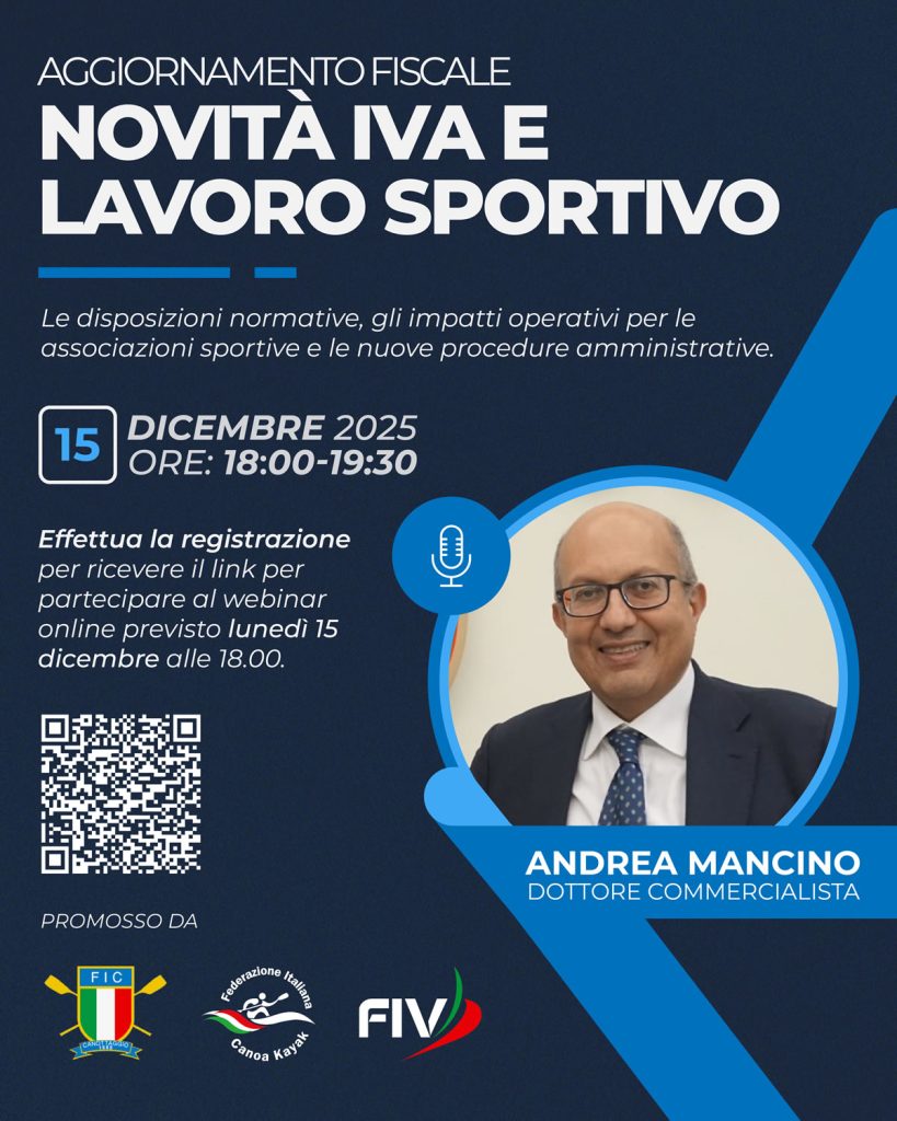 È in programma lunedì 15 dicembre 2025, dalle 18.00 alle 19.30 su Microsoft Teams, il Webinar di aggiornamento fiscale: “Novità IVA dal 1° gennaio 2026 e chiarimenti in merito al lavoro sportivo e ai premi”, promosso congiuntamente da Federazione Italiana Canottaggio (FIC), Federazione Italiana Vela (FIV) e Federazione Italiana Canoa Kayak (FICK).