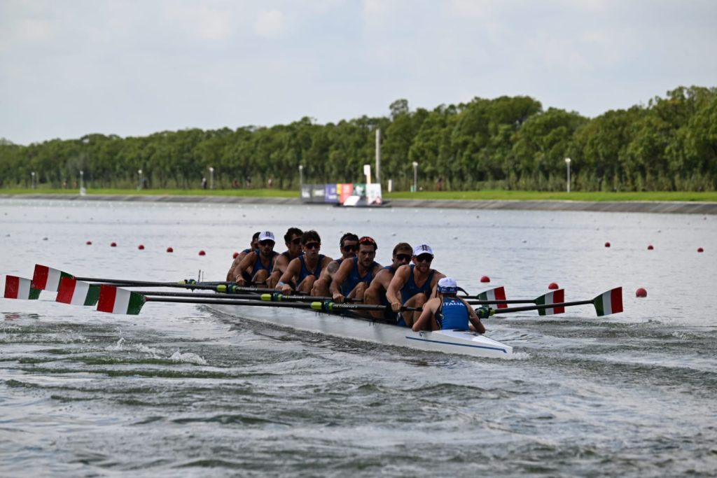 Luca Chiumento, Luca Rambaldi, Andrea Panizza e Giacomo Gentili prendono subito il comando della finale. Partenza forte e buon vantaggio ai 500 sulla Polonia e sulla Gran Bretagna, staccate rispettivamente di 1.61 e 1.80. L’orchestra azzurra suona soavi melodie e delizia sia il pubblico sugli spalti del Shanghai Watersport Centre sia tutti gli italiani collegati da casa. A metà gara, vantaggio raddoppiato (3.25 di ritardo) sugli Stati Uniti, con la Gran Bretagna terza (3.27). Rambo, Chiumi, Paniz e Jack sono padroni della situazione, ai 1500 si fanno sotto gli inglesi che riescono a rosicchiare qualcosa (2.45 di ritardo). L’Italia non si scompone, mantiene saldamente la leadership e gli ultimi 100 metri si trasformano in un magico red carpet. L’Italia vince, l’Italia torna sul più alto gradino con quasi due secondi di vantaggio sulla Gran Bretagna con la Polonia terza. Che meraviglia, sette anni dopo Plovdiv 2018 con il pensiero rivolto al nostro Filippo Mondelli, in barca in Bulgaria, che dall’alto avrà fatto un tifo straordinario per i nostri ragazzi. ITALIA CAMPIONE DEL MONDO! ITALIA CAMPIONE DEL MONDO! ITALIA CAMPIONE DEL MONDO!