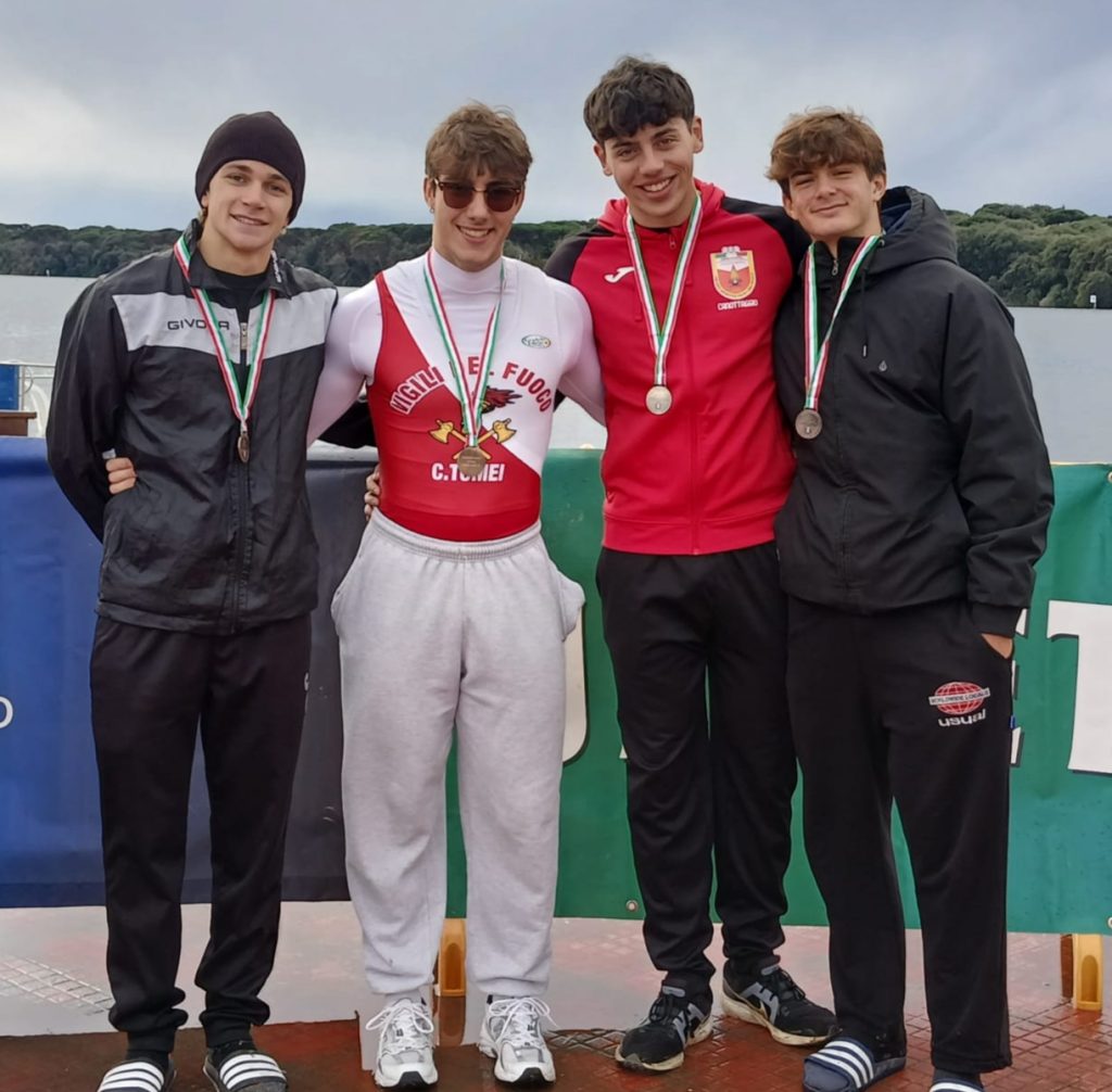 Tra i risultati più significativi del weekend spicca il podio del Gruppo Sportivo Vigili del Fuoco “Tomei” di Livorno, protagonista nel quattro senza maschile Under 19. L’equipaggio composto da: Gabriele Langella, Riccardo De Girolamo, Diego Caruso, Tommaso Spagnoli ha conquistato una splendida medaglia di bronzo, chiudendo alle spalle del CC Saturnia, vincitore del titolo, e del CUS Bari, secondo classificato.